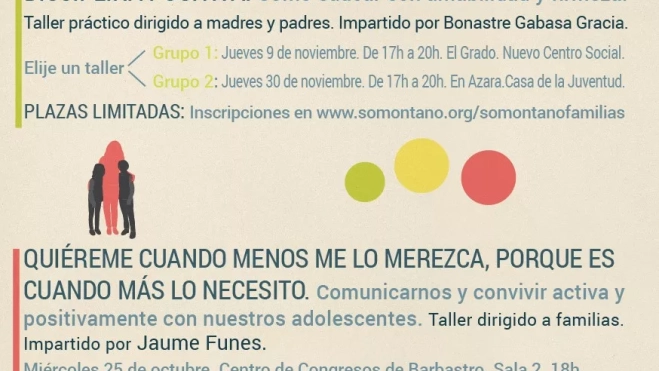 Además, de nuevo se opta por la disciplina positiva como método eficaz para educar a los niños, con dos sesiones impartidas por la psicóloga de la Comarca, Bonastre Gabasa Gracia el 9 de noviembre en el nuevo Centro Social de El Grado y el 30 de noviembre en la Casa de la Juventud de Azara. Ambos talleres que llevan el título ‘Cómo educar con amabilidad y firmeza’ se impartirán de 17.00 a 20.00. Las plazas son limitadas y habrá que inscribirse en www.somontano.org/somontanofamilias . Para facilitar la asistencia, se ofrece de manera paralela un servicio de conciliación/guardería, a cargo de La Maleta Animaciones, en que realizará actividades con los niños mientras los padres están en el taller. Se trata de talleres prácticos cuyo objetivo es promover y fortalecer habilidades personales y parentales en las familias con hijos/as de 3 a 12 años que les permitan construir una dinámica de convivencia familiar positiva a través de dinámicas experienciales y participación activa de los asistentes.
