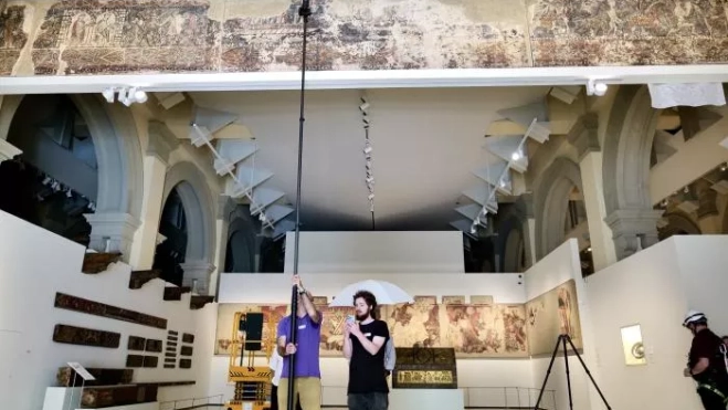 A petición del MNAC, han accedido a la sala 17, donde se encuentran las pinturas profanas, para comenzar los trabajos por este punto, en labores que se han desarrollado durante la mañana, para pasar a continuación a la sala 16, donde se exhiben las pinturas murales de la Sala Capitular de Sijena.