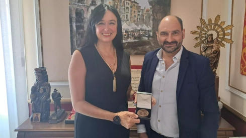 Fernando Torres ha obsequiado a Lorena Orduna con una moneda conmemorativa del Ayuntamiento de Barbastro, cuyo primero ejemplar se entrega a la alcaldesa de Huesca. El regidor de la capital del Somontano ha mostrado el palacio consistorial de su ciudad a la delegación oscense.