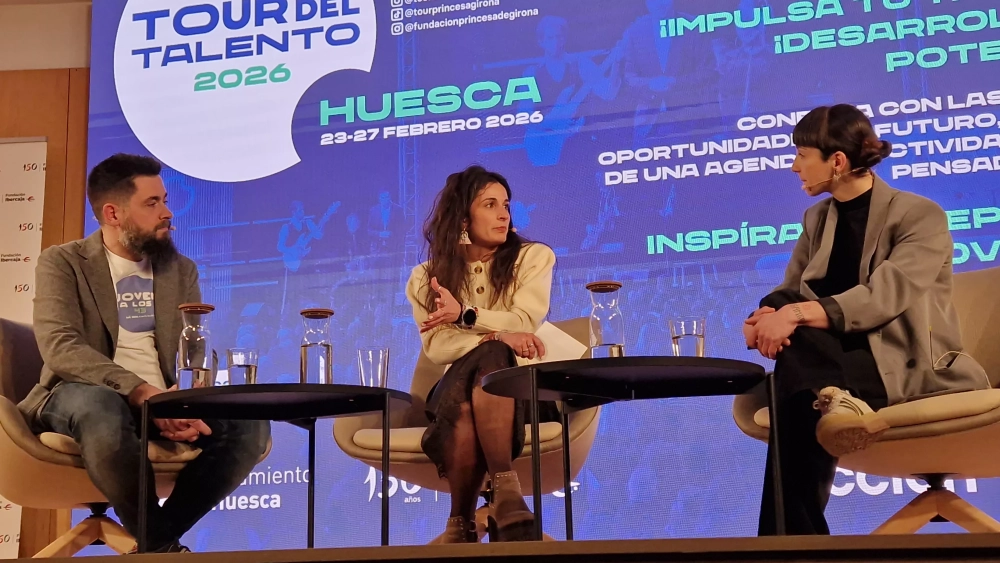 Iris Jordán, jefa de cocina y copropietaria de Ansils, y Raúl Bernal, maestro pastelero y propietario de Lapaca, han intervenido este lunes en la Fundación Ibercaja de Huesca dentro del programa del Tour del Talento, en un diálogo centrado en el esfuerzo, la pasión, la identidad profesional y el compromiso con el territorio. La conversación, moderada por la periodista Alba Echevarría, ha permitido analizar qué hay detrás del reconocimiento gastronómico.