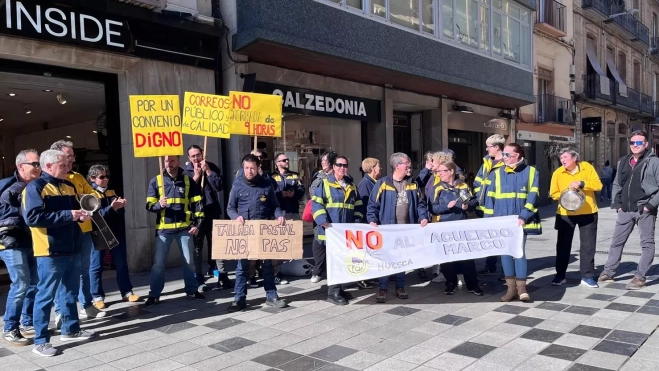 "No al acuerdo marco", "Correos público y de calidad", "por un convenio digno" y "no a la jornada de 9 horas" han sido algunos de los lemas de las pancartas reivindicativas que se han mostrado, y también se ha entregado información a los oscenses sobre la situación del servicio.