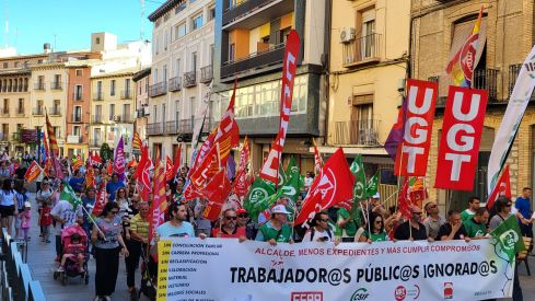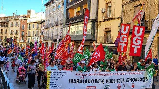 Trabajadores del Ayuntamiento de Huesca han finalizado la huelga de este jueves con una manifestación en la que han querido mostrar su hartazgo por “los recortes e imposiciones” del equipo de gobierno y han reclamado al alcalde, Luis Felipe, que negocie.
