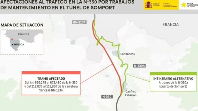 Para facilitar la circulación del tráfico durante esa semana, se dispone de un itinerario alternativo por la carretera N-330A, a través del Puerto de Somport.
