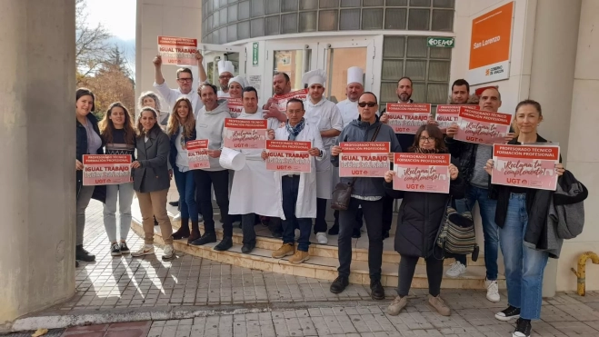 El profesorado técnico de FP se ha concentrado este miércoles a las puertas de diferentes centros de enseñanza secundaria en Aragón, convocados por UGT Servicios Públicos "ante la discriminación salarial que sufre parte de estos profesionales al no ser integrados en el cuerpo de Enseñanza secundaria, desempeñando el mismo trabajo y percibiendo entre 200 y 400 euros menos de salario mensual. La protesta se ha realizado bajo el lema “a igual trabajo, igual salario”.