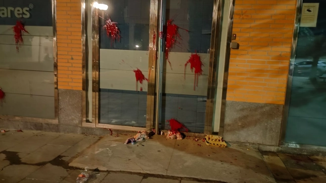 La fachada ha quedado manchada por pintura roja (se supone, no creemos que se trate de sangre animal), plasmada en no menos de diez lanzamientos, mientras que la zona de la puerta ha sido específicamente teñida también con el mismo color.