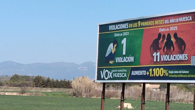 El Grupo Municipal de VOX en Huesca ha colocado carteles en las vallas publicitarias de los accesos a Huesca en los que denuncia que las violaciones se han multiplicado por once en la ciudad en dos años, desde 2023 hasta 2025.