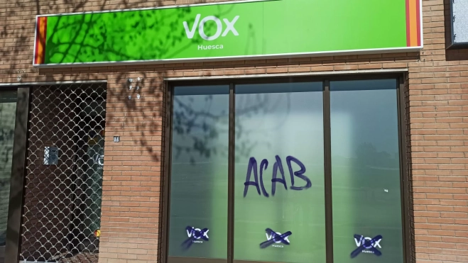 VOX Huesca ha denunciado un nuevo ataque vandálico contra su sede provincial, después de que la cristalera del local apareciera con pintadas realizadas con spray durante la jornada de este pasado lunes. Entre los mensajes, se podía leer la sigla “ACAB” (“all cops are bastards”), además de varios logotipos de la formación tachados, lo que ha provocado daños materiales en el inmueble.
