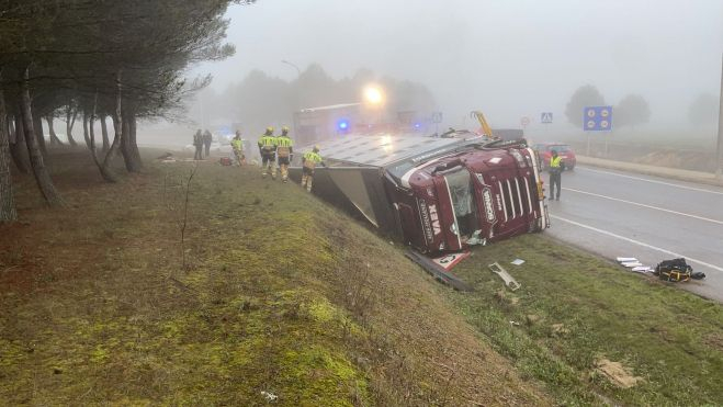 Por su parte, el vehículo ha quedado tumbado sobre parte de la calzada y el arcén. Se trata de un camión, con matrícula extranjera, que transportaba en torno a 1.000 cerdos pequeños procedentes de una granja de la provincia de Huesca, muchos de los cuales han muerto a consecuencia del accidente.