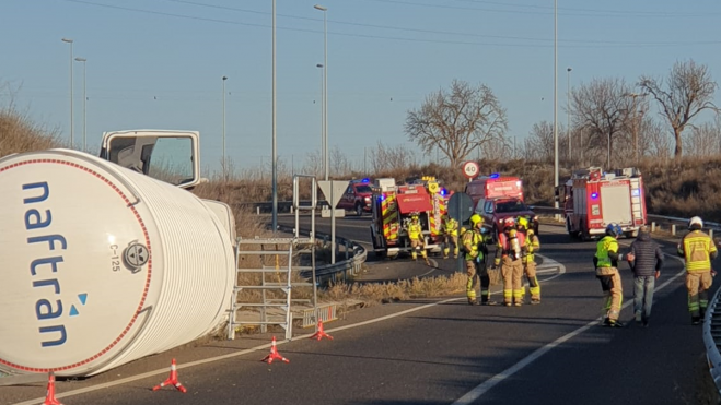 El vuelco de un camión cargado de gas natural en la salida hacia Fonz de la A-22 ha hecho que se active el Plan de Mercancías Peligrosas de Aragón (Procimer).
