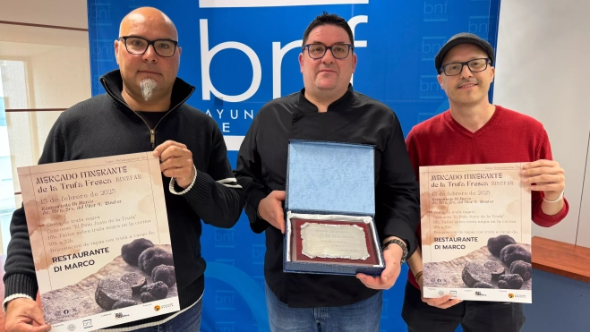 El concejal de Fomento y Desarrollo, Miguel Ángel Pascual, el vicepresidente de la Asociación de Recolectores y Truficultores de Aragón, Oriol Torné, y el chef del Restaurante Di Marco, Javier Bardají, han presentado los detalles de la jornada que comenzará a las 18.00 horas con una charla sobre cómo cocinar en nuestros hogares con trufa en la primera planta del restaurante, donde también se celebrará el Mercado de la Trufa Fresca en el que, además de la venta directa, se sorteará un ejemplar entre los asistentes que adivinen su peso exacto.