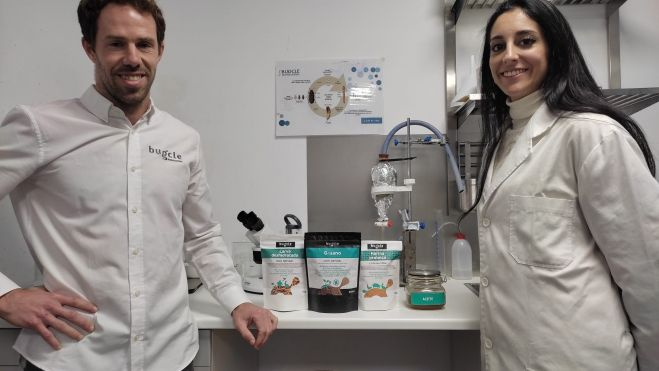 La circularidad es innegociable. La larva deviene en aceite, harina y abono, que se distribuyen desde la industria animal en granjas y agricultura, horticultura y viveros, veterinarias y un planeta más sostenible. El conocimiento es el eje de toda la perspectiva de Bugcle. En Huesca, están investigando la automatización y la industrialización con el control de reproducción del insecto. Si se mejora y su engorde es más rápido, su eficiencia tendrá todas las garantías. Para hacernos a la idea, Javier Luis explica que la harina de insecto tiene una potencia proteínica del 70 % por el 30-40 por cada cien gramos de la soja. Sucede lo mismo con el aceite y su alto contenido de grasas insaturadas, que lo hace propicio para piensos y farmacia. "Para los productores de pienso la inclusión de macros y micronutrientes de calidad en sus formulados de pienso con el uso de nuestra harina y aceite.