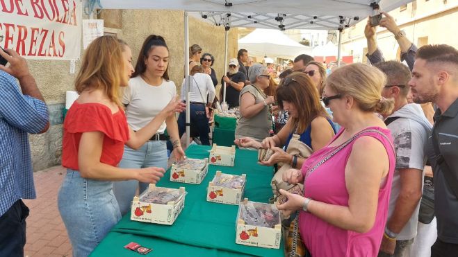 La Asociación de Amas de Casa A Cerecera es el alma de la Feria desde sus orígenes. Fina, su presidenta, con su blusa diseñada con cerezas, está feliz. "Estamos viviendo un ambientazo, un día estupendo para el que no se haya acercado pueda venir. Pero, eso sí, llevamos muchas cerezas ya vendidas. Este año es espectacular. Un fruto excelente de sabor y de calibre, luego también tenemos otros productos, pero lo fundamental es la cereza y las expectativas se están cumpliendo con creces".