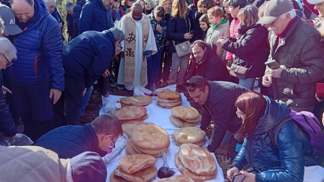 Las tortas se han dispuesto sobre el mantel blanco en el suelo para ser bendecidas y, poco a poco, los insectos han asomado. El párroco ha pedido al señor que la fe y la cultura "permanezcan unidas" y ha bendecido las tortas: "Que las cosechas venideras sean fructíferas para el beneficio de todos ustedes". Dicho y hecho, al aroma del dulce de anís y del vino han empezado a llegar los insectos, curiosos y ávidos de libar tan extraordinarios manjares.
