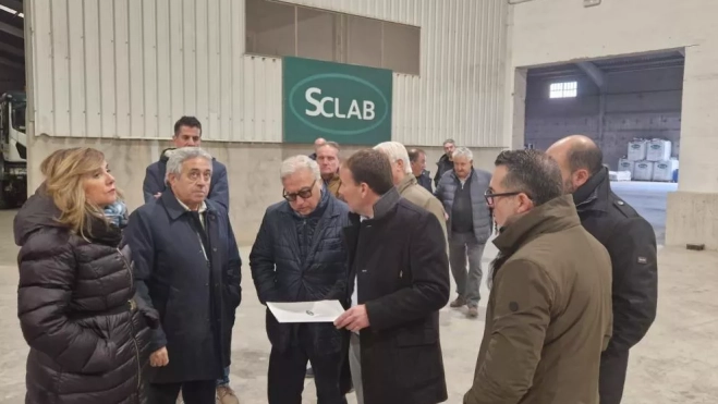 El consejero de Agricultura, Ganadería y Alimentación del Gobierno de Aragón, Javier Rincón, acompañado por la directora general de Innovación y Promoción Alimentaria, Amparo Cuéllar, ha visitado hoy la Sociedad Cooperativa Limitada Agrícola de Barbastro (SCLAB) y posteriormente la empresa Cleris