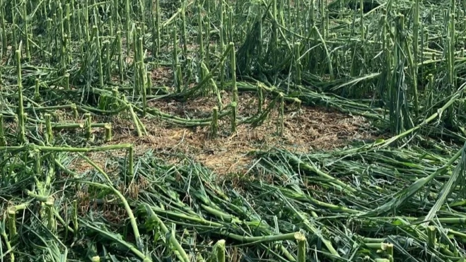 El fenómeno, similar a un tornado, destrozó la cosecha de maíz y alfalfa. Se da la circunstancia de que la cosecha de maíz de segunda siembra se halla en un momento delicado, en su punto de floración, por lo que la pérdida es total.