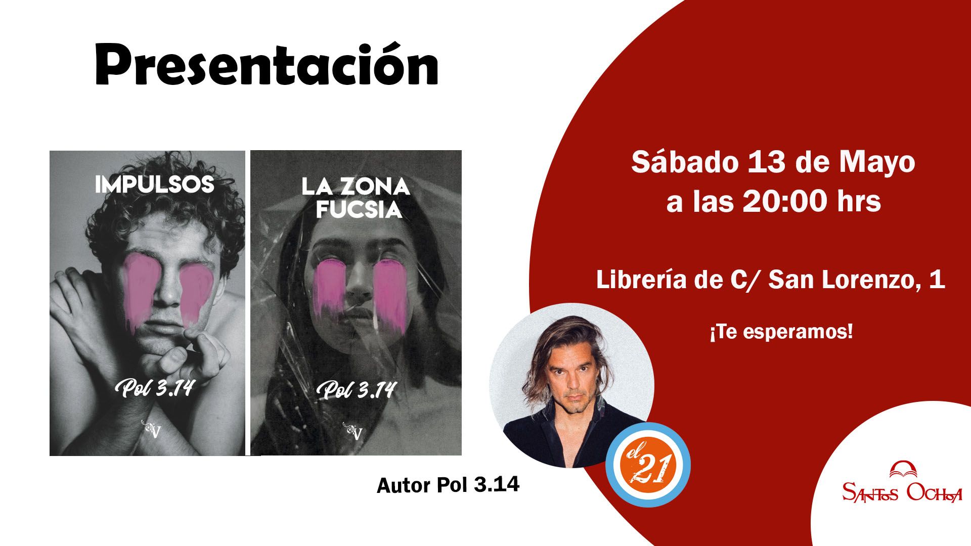 A las 20:00 horas, la librería Santos Ochoa situada en la calle San Lorenzo, 1, contará con la presencia del cantante y autor Pol 3.14, que presentará y firmará su dos libros Impulsos y La zona fucsia.