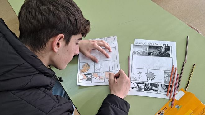 “Fuimos seleccionando imágenes de las películas, las dibujamos y montamos la estructura del cómic”, señala Olivar. Posteriormente, se repartió el trabajo entre el alumnado que fue dibujando las viñetas con la ayuda del profesor. El último paso fue fotografiarlas y pintarlas con el programa de diseño gráfico Photoshop.