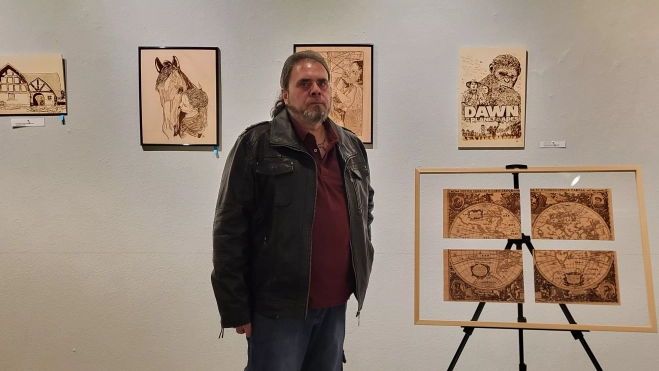 Jesús Naya, nacido en Almudévar y residente de Huesca, es un gran dibujante y pintar era una de sus pasiones, pero un problema de salud le hizo tener que desistir. La pandemia le devolvió la técnica del pirograbado que había conocido cuando estuvo interno en el colegio de los Corazonistas, en Navarra. “El olor de la pintura me venía fatal -explica Naya- y el pirograbado, aunque suene raro, no produce ni humo ni olores, ya que que no quemas con mucha intensidad” y utiliza un tipo de madera específica.