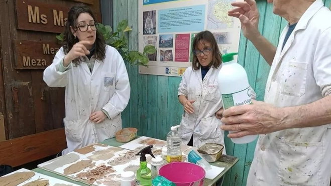 Durante el proceso formativo, vinculado al proyecto europeo InclusiVET y en el que participan personas con y sin discapacidad, el grupo visitó la Cartuja para conocer de primera mano el legado pictórico de Fray Manuel Bayeu y realizó una salida por el entorno natural de Los Monegros para identificar y recoger sedimentos utilizados posteriormente en la creación de pigmentos naturales.