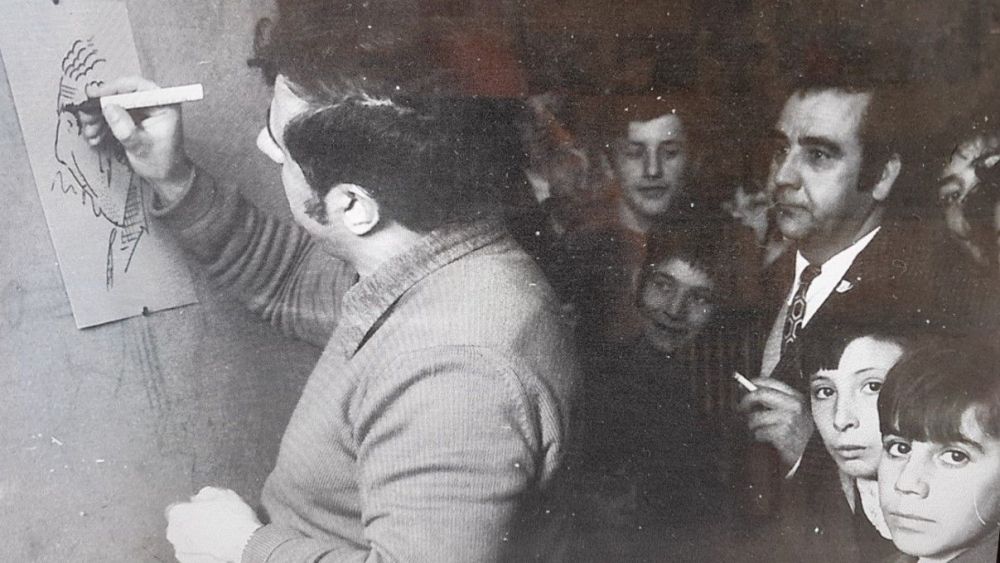 Alejandro Brioso, destacado acuarelista y caricaturista en plena faena haciendo su trabajo con Paco Gilete, en la Fiesta de la Unión de los antiguos alumnos en 1972