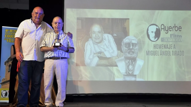 Pero el instante más emotivo llegó con el homenaje a Miguel Ángel Tirado. Un montaje fotográfico repasó su trayectoria antes de que subiera al escenario acompañado por Alejandro Salcedo, presidente de la Asociación Ayerbe Film Festival. El público le dedicó una interminable ovación que llenó la sala de cariño.