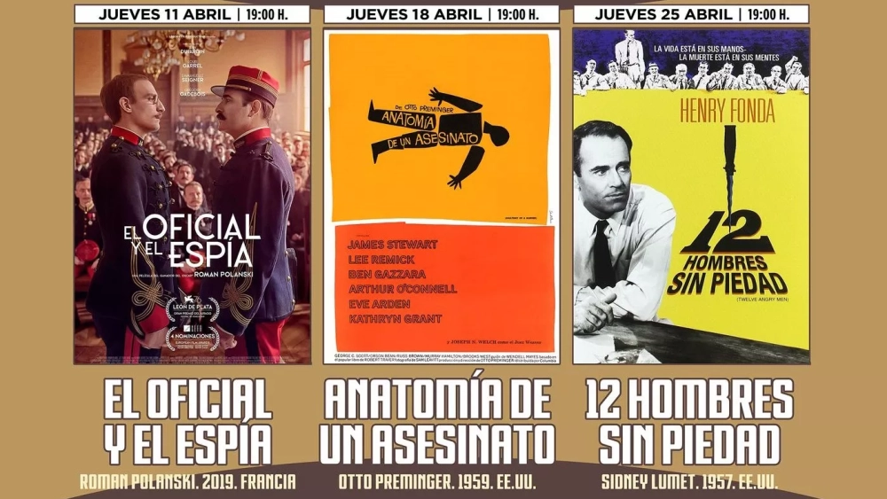 Las películas elegidas son El Oficial y el Espía (2019), de Roman Polanski, prevista el 11 de abril a las 19.00 horas; Anatomía de un Asesinato (1959), de Otto Preminger, prevista el 18 de abril a las 19.00; y 12 Hombres sin Piedad (1957), de Sydney Lumet, prevista el 25 de abril a las 19.00.