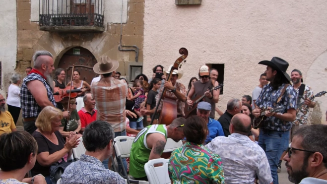 En un espacio delimitado acomodan sus instrumentos. La plaza Santa Agueda de Fornillos aparece llena de público de edades muy diversas. El sonido ha sido ya probado con anterioridad y lo cierto es que se ha escuchado de manera espectacular en este rincón del Aragón rural.