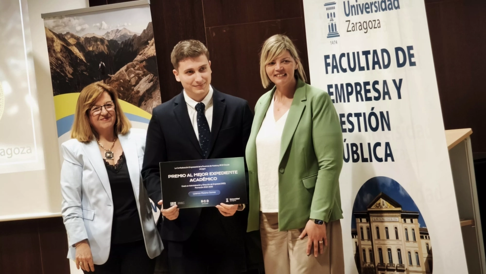 Uno de los momentos centrales de la jornada ha sido la entrega de los Premios Extraordinarios de Fin de Carrera, distinciones que reconocen los mejores expedientes académicos de cada titulación. En esta edición, los galardones han recaído en Andrea Llorente, del Máster en Dirección y Planificación del Turismo; Laura Mairal, del Grado en Gestión y Administración Pública; y Lorenzo Moreno, del Grado en Administración y Dirección de Empresas. Este último ha sido además distinguido con el premio de la Confederación Empresarial de la Provincia de Huesca —entregado por RCD Circular— en reconocimiento a su brillante trayectoria.