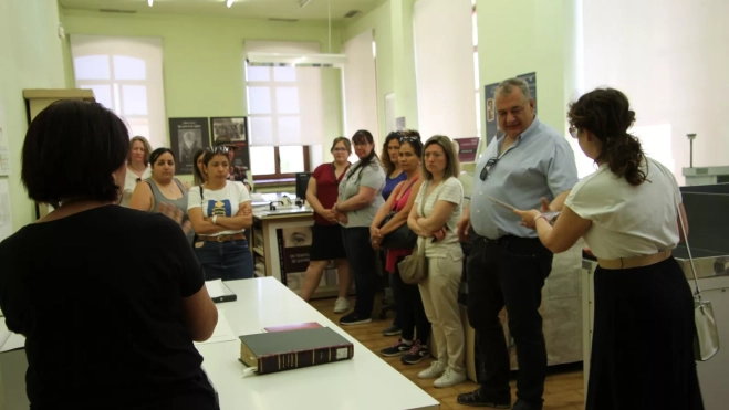Para concluir la visita, se digitaliza ante los visitantes un documento y se exponen las ventajas de la digitalización documental y su subida al buscador Documentos y Archivos de Aragón (Dara). Como recuerdo de la visita, los participantes reciben un lapicero con el nombre del archivo.