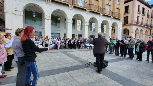 Más de un centenar de voces unidas en canciones que hablan de paz, de hermandad y de alegría se han alzado este domingo en la plaza López Allué de Huesca para sumarse a las de otras muchas personas que en otras ciudades de España han hecho lo mismo, en una iniciativa que se inició el año pasado bajo el epígrafe Coros por la paz.