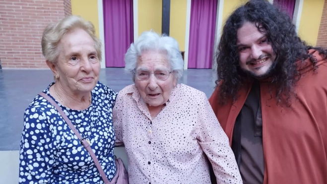Hasta el Corral de Comedias, para disfrutar de la Celestina interpretada por el gran Roberto, fue con Manolita Luna, que fue alumna suya hace 75 años y hoy ya cuenta con 85 con un aspecto magnífico.