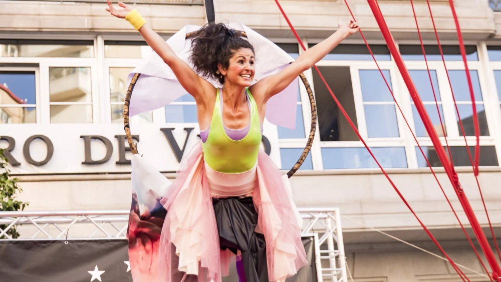 La representación correrá a cargo de la compañía gallega Sempre Arriba, que plantea una experiencia escénica dirigida a todos los públicos en la que se combinan acrobacia aérea, clown, música y participación del público. Concebido como una gran celebración en el espacio público, el espectáculo invita a disfrutar del momento presente y a compartir una experiencia colectiva.
