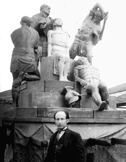 Felipe Coscolla fue escultor activo y con aceptación. Nació en Graus y desde pronto su familia se tuvo que trasladar a Barcelona. Allí se entrenó en el arte de la escultura. Fue ampliamente conocido y dejó obras todavía emblemáticas en Barcelona y Chile, a donde tuvo que desplazarse dejando numerosas esculturas en los seis años que permaneció en aquel país. Su arte se desenvolvió en los parámetros propios de la década de los veinte del siglo XX, que, simplificando, tenían la robustez expresiva inherente al arte que hemos clasificado como modernismo. Con ese lenguaje estético hizo para Huesca pasos como el Prendimiento, Descendimiento (1923), y Enclavación (1928). Hizo también un Cristo Resucitado para Barbastro que fue depurado en la infausta Guerra Civil.
