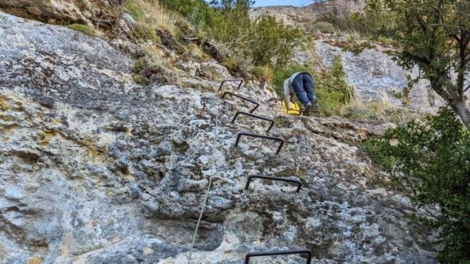 A tal efecto se desplazaron en automóvil hasta las postrimerías del Salto de Roldan, esa “Muesca” pétrea que campea junto al caballero ilergete en el escudo de la Ciudad. Un lugar muchas veces visitado por los jóvenes excursionistas y montañeros, para alcanzar la cima de la peña llamada Aman, Men, o San Miguel, pues de estas denominaciones se ha hecho uso desde antiguo, y contemplar la panorámica de la Hoya de Huesca, algo indescriptible, cautivando siempre a los esforzados que han accedido a ella. Pero en este caso se trataba de la inauguración de un nuevo sistema que haría más accesible su acceso a la cima, se trataba de unas clavijas, en término montañero, o grapas en término coloquial que componiendo un camino a modo de escalera, abría un nuevo medio de ascensión a la peña de San Miguel, evitando, claro está, el rodeo por aquella ingente montaña salvando algunos pasos de verdadero peligro.