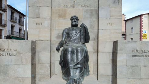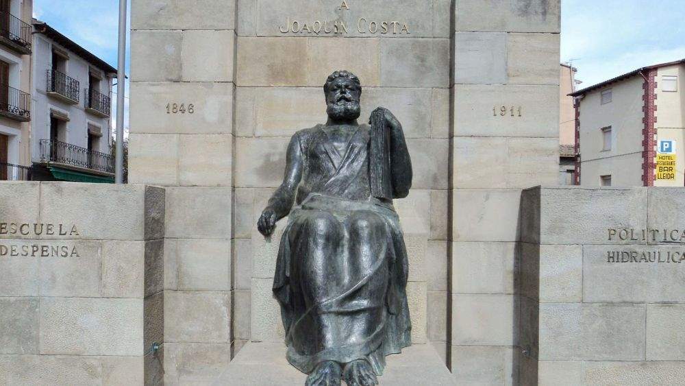 Joaquín Costa nace en Monzón en 1846 y muere en Graus en 1911. Hijo de labradores modestos y primogénito entre 11 hermanos. Trabaja de criado, cochero y albañil en Huesca y, al mismo tiempo, estudia bachillerato. Allí en Huesca funda en 1866 el Ateneo del Pueblo. Consigue ir pensionado a París en 1867. Al año siguiente publica su primer libro Ideas de la Exposición de París de 1867, donde ya aparecen sus inquietudes sociales y economicistas. En 1869 obtiene los títulos de bachiller y de maestro. Ese mismo año inicia en la Universidad Central sus estudios de Derecho y Filosofía y Letras y tiene como condiscípulos a Menéndez Pelayo, Canalejas y Leopoldo Alas, entre otros. Entra en el círculo krausista de Sanz del Río y gana la amistad de Giner de los Ríos. Se licencia en Derecho en 1872 y al año siguiente en Filosofía y Letras, aunque sus penurias económicas son grandes.