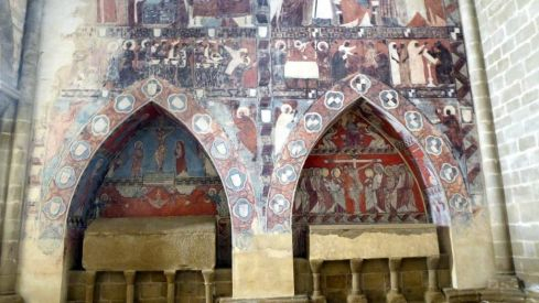 El Panteón.- En los dos lados o muros del crucero, amplios arcos ojivales, cuyos vanos fueron destinados para proteger los sepulcros de grandes dimensiones. Dentro de este gran tesoro de belleza que encierra Foces siempre destacó la pintura mural que ornamenta los huecos de los sepulcros. La pintura del sepulcro de D. Atho de Foces representa a Jesús crucificado, con la Virgen y San Juan á los lados en el cuerpo alto; debajo se extiende una bonita orla bizantina y en el centro una cartela con inscripción; debajo, dos ángeles en actitud de volar, conduciendo un alma al cielo: en el intradós del arco completan la decoración dos ángeles y dos santos. La decoración del segundo sepulcro consiste en Jesús crucificado también, ocupando el centro, y ambos lados los apóstoles; corre otra bonita orla bizantina que separa este cuadro del superior que ocupa el tímpano, donde se representa al Salvador sentado en un trono: en el intradós, en la parte alta, hay ángeles, y debajo de estos, San Francisco a un lado y Santa Catalina; al otro lado, Santa Margarita y san Juan Bautista.