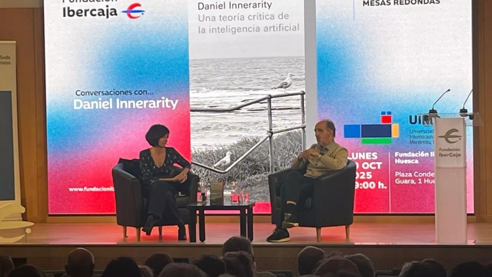 El filósofo y ensayista Daniel Innerarity cerró con brillantez el ciclo Conversaciones de otoño de la Universidad Internacional Menéndez Pelayo, sede Pirineos, con una charla en la Fundación Ibercaja de Huesca. Acompañado por la politóloga Carmen Lumbierres, dialogó sobre su último libro, Una teoría crítica de la inteligencia artificial, en el que analiza la relación entre tecnología y democracia. Innerarity defendió que “el gran desafío de la humanidad es juntar bien poder y conocimiento”, en una conversación cercana que despertó el interés del público asistente.