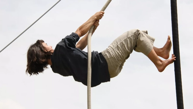 En la tórrida mañana del domingo, los jardines del museo CDAN de Huesca acogieron el espectáculo de circo contemporáneo “De algodón y caucho”, de la compañía Mala Brigo, propuesta que explora el universo rural y sus significantes. Dos artistas, un mástil chino en medio de la escena, danza, portes acrobáticos y cuerda lisa. Y el juego con un montón de capazos de mimbre que ahora están al servicio de esta historia.
