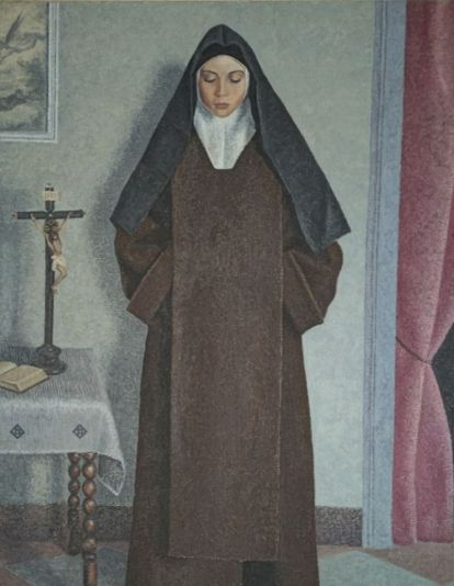 El óleo entregado hoy a la parroquia de Quinzano representa a una monja carmelita en un interior que rememora la quietud de un convento. Imponente retrato, la figura desprende con sutil delicadeza una profunda espiritualidad.