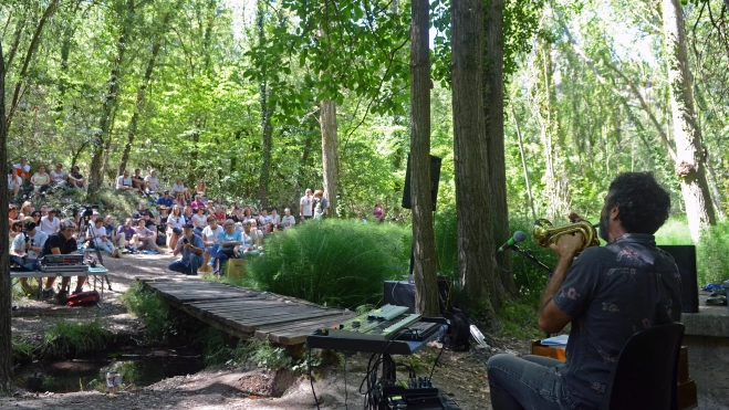 El verdor del bosque de ribera, repleto de “cola de caballo” (Equisetum arvense), una planta de propiedades medicinales usada para trastornos de vejiga y riñones; la sombra de los chopos, sauces y nogales, y el fluir del agua hasta quedar retenida en un estanque de cuento infantil, eran el escenario perfecto para la lengua y la música enigmáticas, para un proyecto arriesgado que el público aceptó al final como suyo.