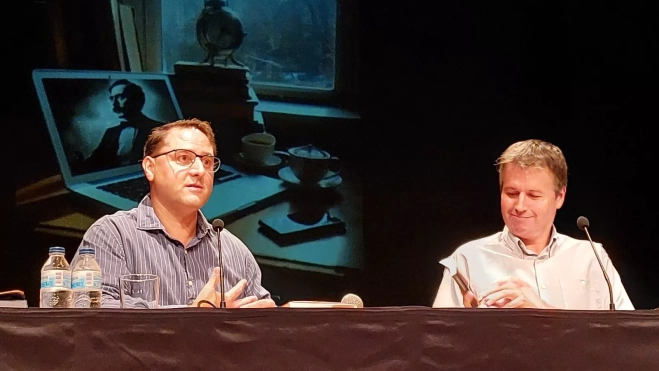 El presentador incurre en la locura de Poe. "Este libro me ha dejado la cabeza regular", afirma José Perié. "No es que la hubieras tenido antes diferente", replica divertido Mariano de Meer. Y cierra para abrir el introductor. "Buenas tardes a todos, es un placer para mí presentar para el autor del efecto Poe".