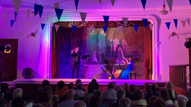 El Salón Social La Cultural de Tormos, enclave histórico erigido durante la construcción del pantano de La Sotonera, se llenó el sábado de magia y delicadeza con el concierto "Colores Sonoros" con el dúo navarro de Ekhi Ocaña a la flauta y Alicia Griffiths al arpa en un recital de la era impresionista, que abarca finales del siglo XIX y principios del siglo XX.