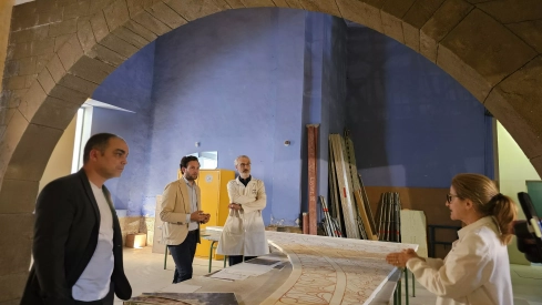 El presidente de la Diputación Provincial de Huesca, Isaac Claver, acompañado del diputado de Cultura, Carlos Sampériz, ha conocido el taller de la escuela donde hay colocado un arco a escala real que recrea los de la sala capitular y cuyas obras originales deben de ser devueltas a Villanueva de Sijena tal y como ordenó el Supremo.