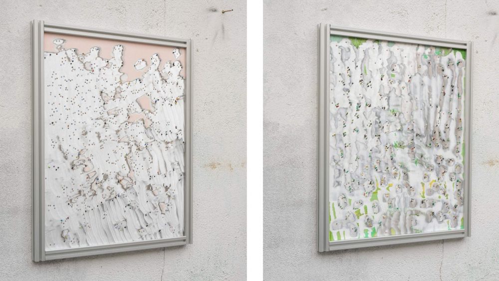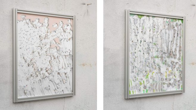 Tallos es un acrílico sobre papel y aluminio perforado, 65 x 54 cm c/u, 2021. El desarrollo evolutivo de este díptico encuentra su origen en la exposición La cuarta generación donde se activó por primera vez la pintura mediante procedimientos industriales, inyectando acrílico en el reverso del soporte de aluminio, previamente perforado de tal manera que surgían las “semillas” en la superficie metálica.