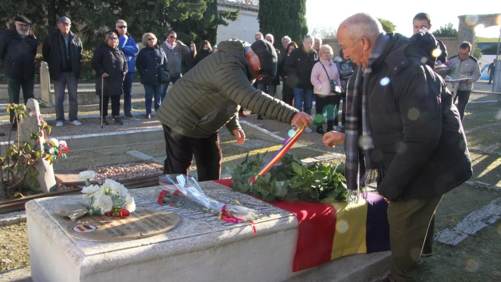 Posteriormente la comitiva se ha dirigido al nicho de Ángel García, en el cual se ha continuado con la ofrenda floral que, en esta ocasión, ha rendido homenaje también al conductor Longás, fallecido en la sublevación.