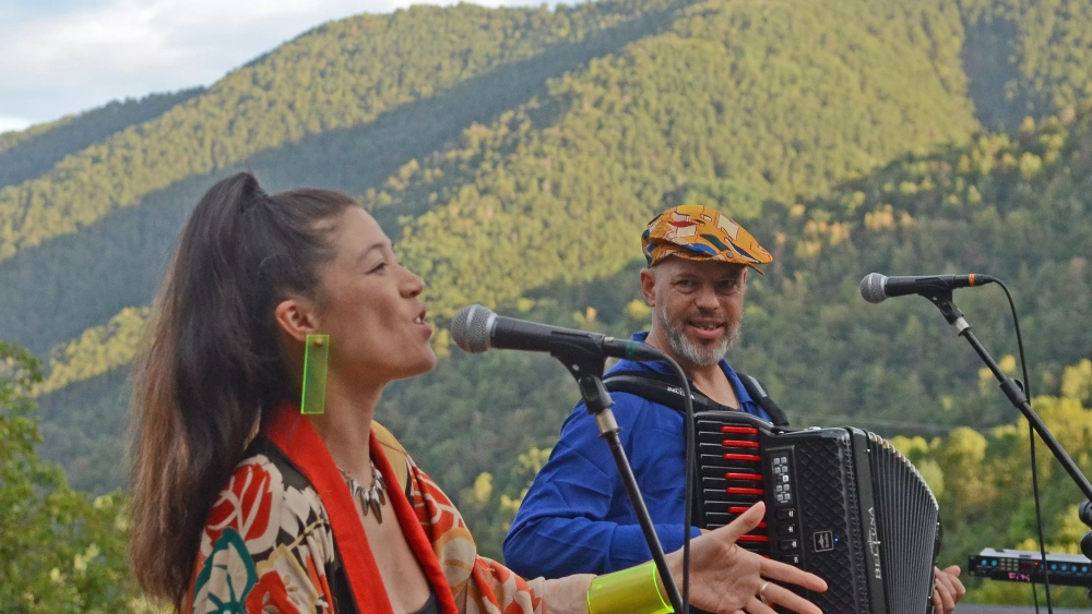 La japonesa residente en París, Maïa Barouh, y el acordeonista francés Fixi, conquistaron el corazón artístico del público reunido en los jardines de la iglesia de San Miguel de Linás de Broto. La fusión de la música ancestral japonesa y el clásico acordeón francés deslumbró ayer en el primer concierto de la gira del Sonna Huesca por la comarca de Sobrarbe.