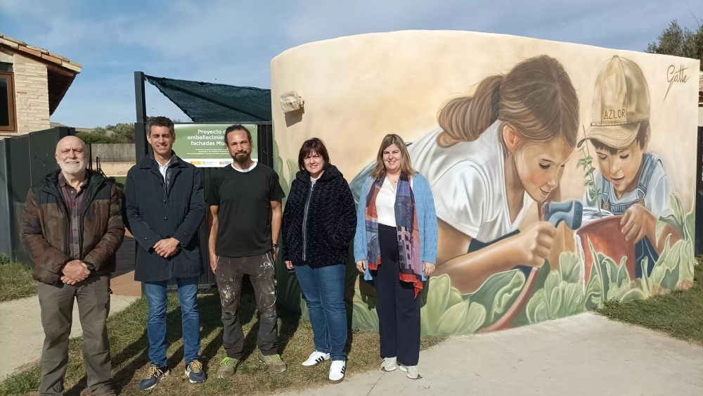 El primero de los siete murales que el aerografista barbastrense Gatta creará en otras tantas localidades dentro del Plan de Sostenibilidad Turística Saborea Guara Somontano ya luce en el muro de la piscina de Azlor. El agua, elemento básico de la agricultura y la gastronomía, con la que dos niños riegan una maceta en una huerta cualquiera de las muchas que pueblan el territorio, da la bienvenida a los vecinos y visitantes que paseen por este rincón del pueblo.