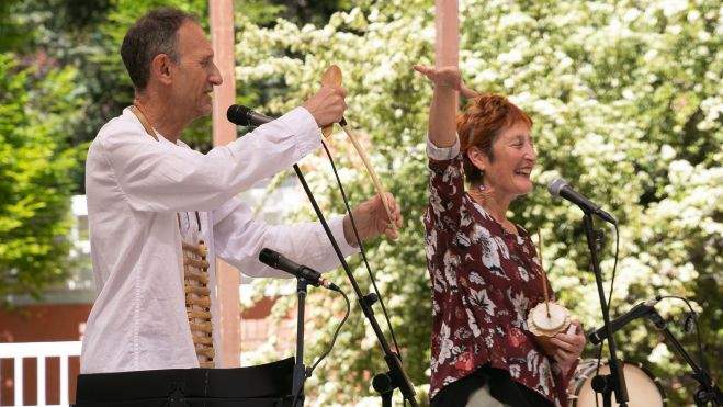 La Chaminera: "¿Te fa buen sentir?" Con esta propuesta se ha desarrollado este lunes la actuación de la formación aragonesa en el Parque Miguel Servet de Huesca, incluida en el programa Aragón Tierra Abierta organizado por el Ayuntamiento en torno a la festividad de San Jorge, patrono de Aragón.