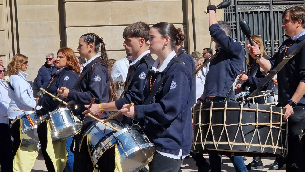 La jornada también ha incorporado la presencia de agrupaciones procedentes de otras localidades. Entre ellas ha acudido la banda de bombos y tambores Villa de Azanuy. Aurora Avellana, miembro de la junta de la asociación, ha explicado que la agrupación nació en 2005 y que el pasado año celebró su 20 aniversario. La banda ha participado en actuaciones en las tres provincias aragonesas y reúne habitualmente entre 25 y 30 integrantes, aunque al encuentro han acudido alrededor de 20, con edades comprendidas entre los 3 y los 73 años.