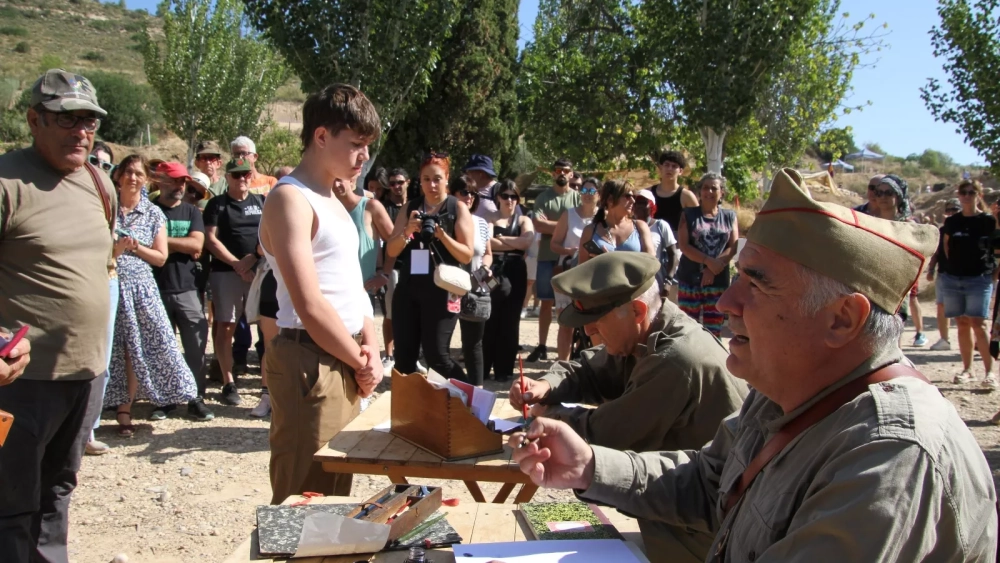 na veintena de hombres y mujeres de Primera Línea, asociación oscense de recreacionismo de la guerra de 1936, acudieron al llamado, en su XVII edición, de los Voluntarios de Fayón para recrear el paso del Ebro, uniendo sus fuerzas a las de otras entidades con idénticos fines. La recreación de esta decisiva batalla de la Guerra Civil incluyó medios por aire, tierra y agua. Se saldó con la participación de unos 300 recreacionistas de toda España y de Francia, y, en esta ocasión, con participantes de Estados Unidos.